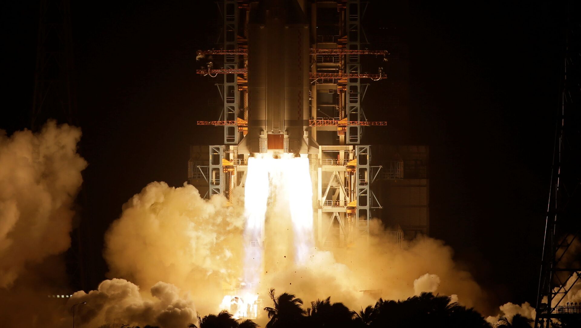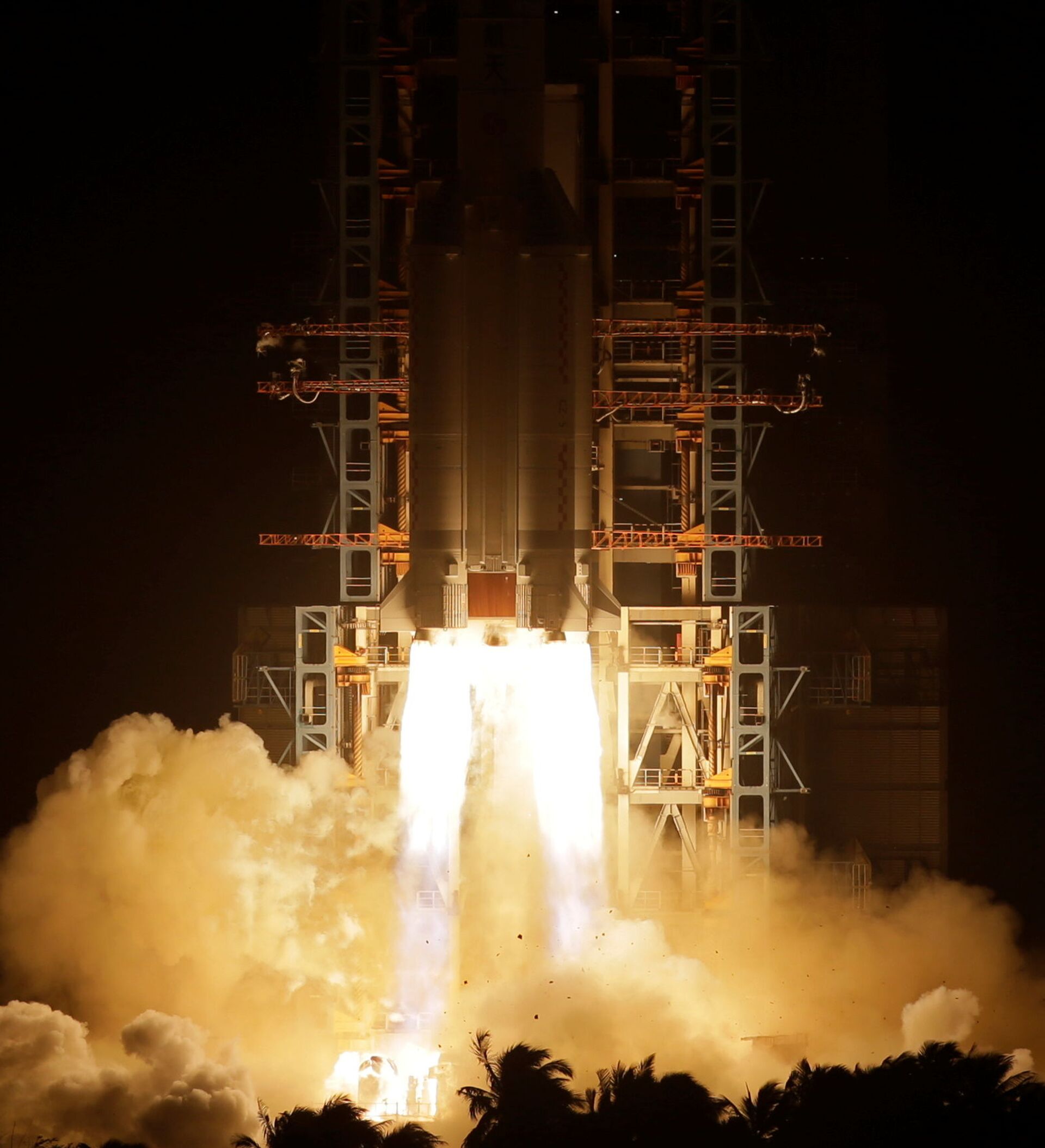 Foguete espacial chinês Long March-5 deixa área do Centro de Lançamento Espacial de Wenchang.