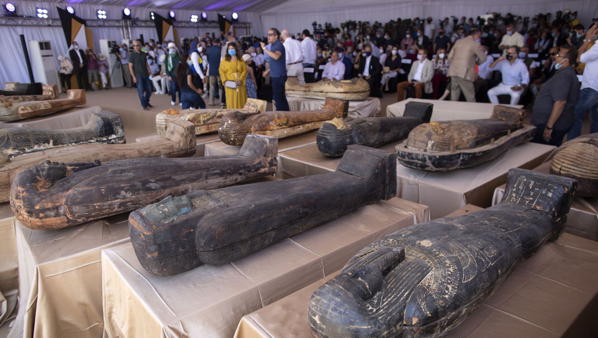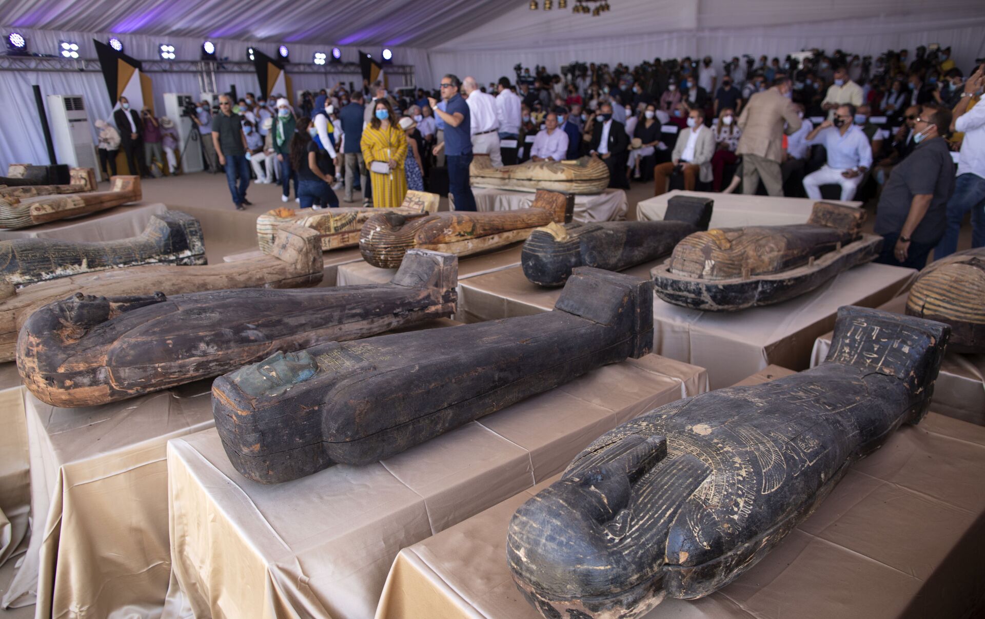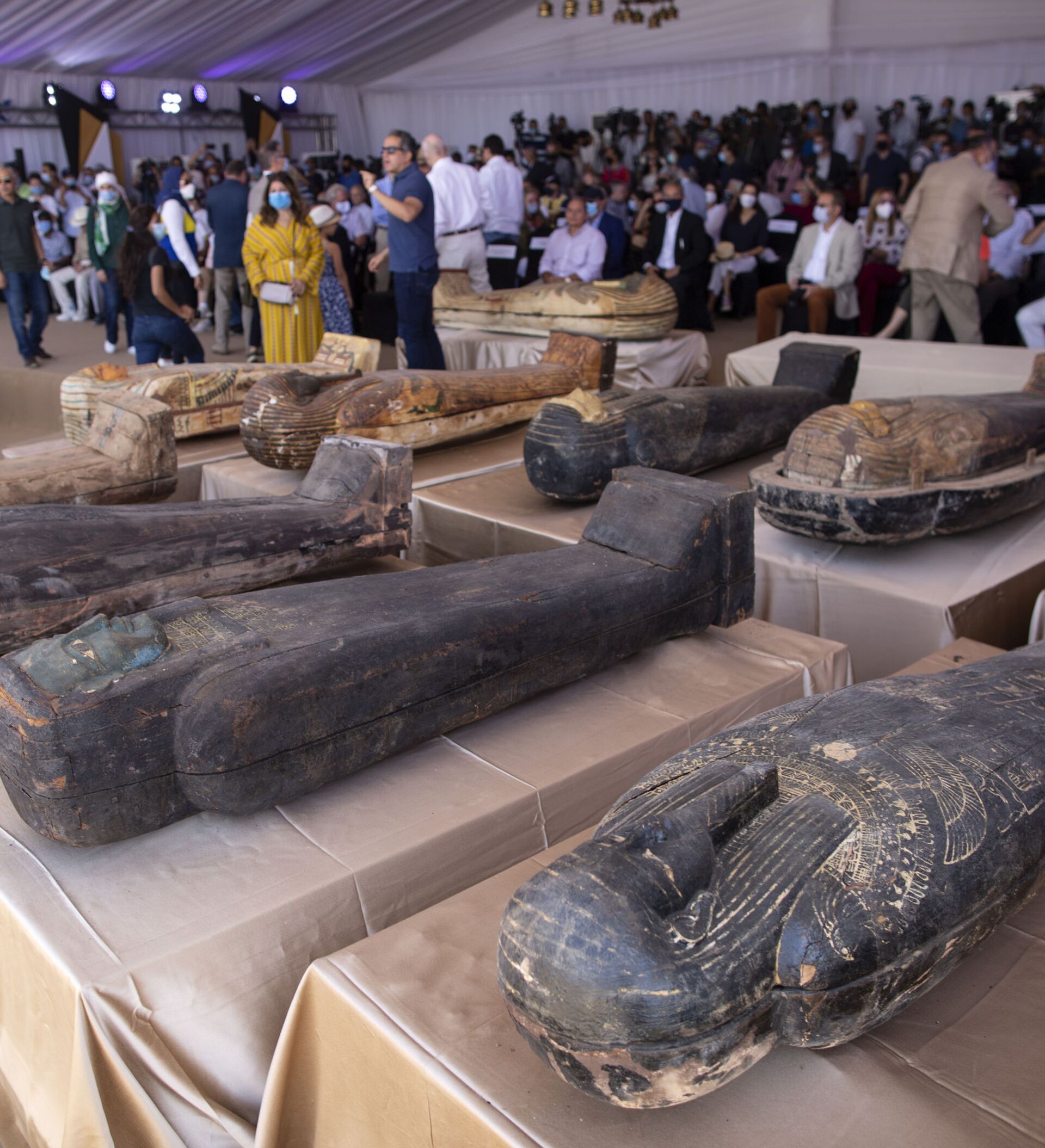 Arqueólogos descobrem 59 sarcófagos com múmias de mais de 2.600 anos em Saqqara, Egito.