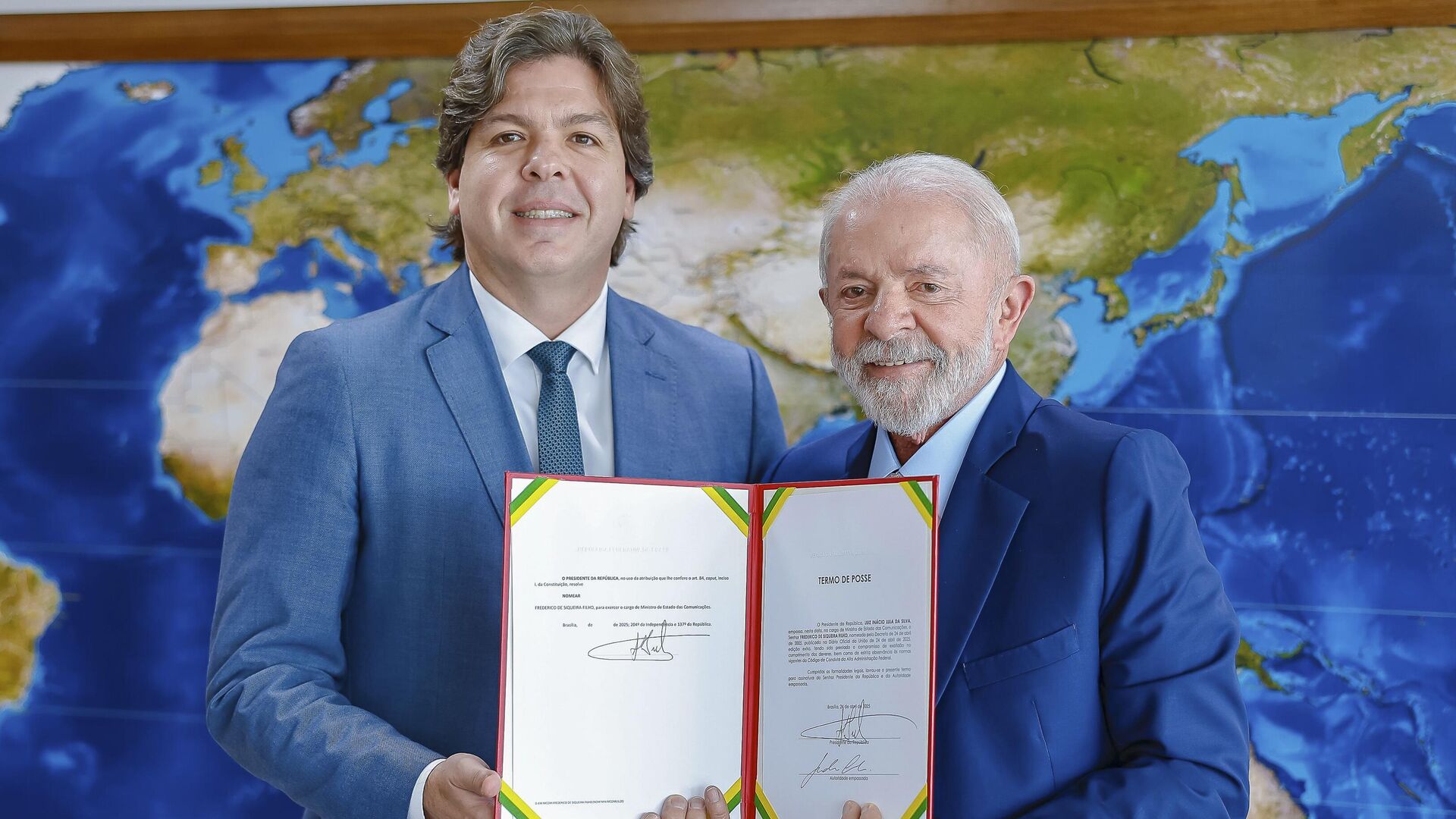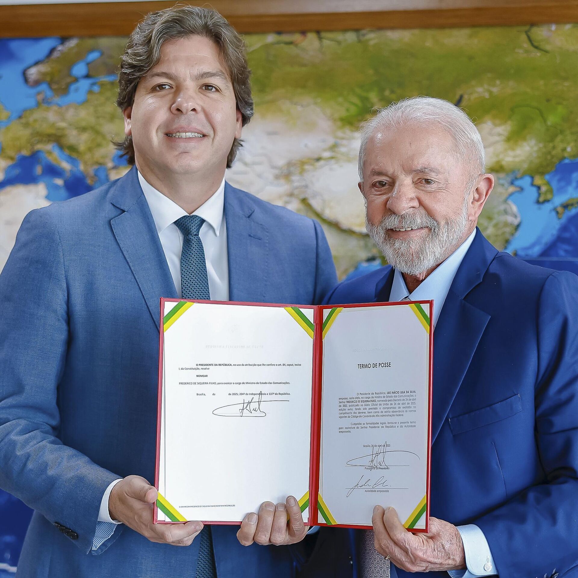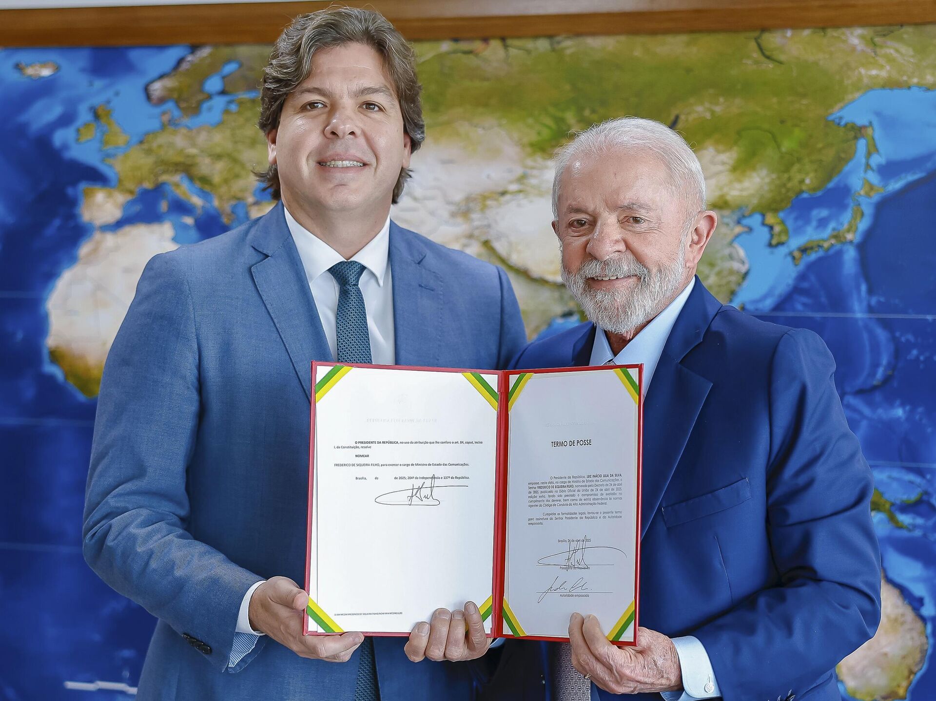 15:45 24.04.2025 (atualizado: 15:59 24.04.2025) Frederico de Siqueira Filho, presidente da Telebras, foi nomeado nesta quinta-feira (24) ministro das Comunicações pelo presidente Luiz Inácio Lula da Silva. Ele tomou posse após reunião no Palácio do Planalto.
