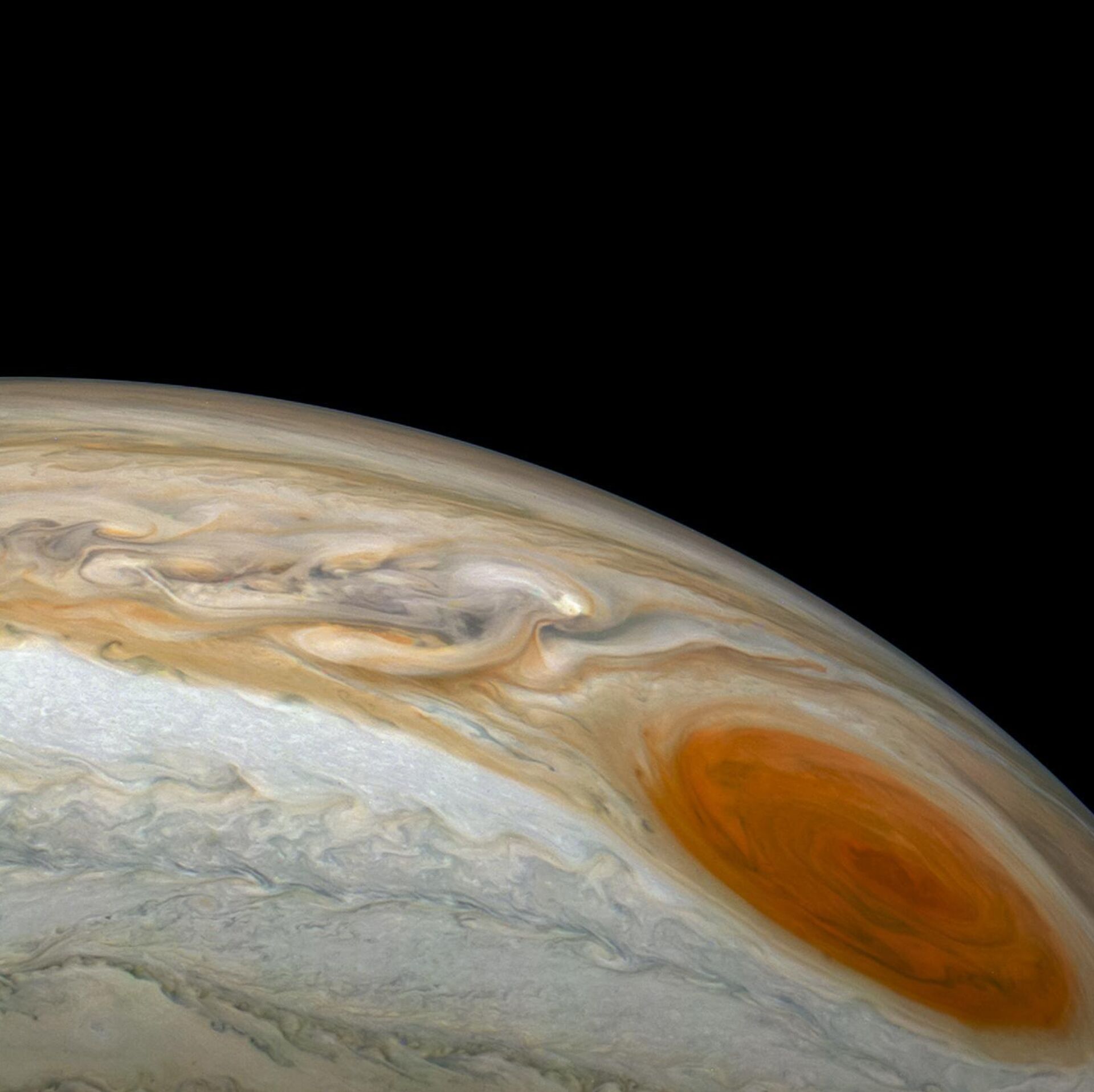 A missão Juno da NASA capturou estas imagens de Júpiter durante seu 59º sobrevoo próximo ao planeta gigante proporcionando uma boa visão dos cinturões coloridos e das tempestades em espiral de Júpiter, incluindo a Grande Mancha Vermelha, e dois vislumbres mais detalhados da pequena lua Amalteia, 7 de março de 2024