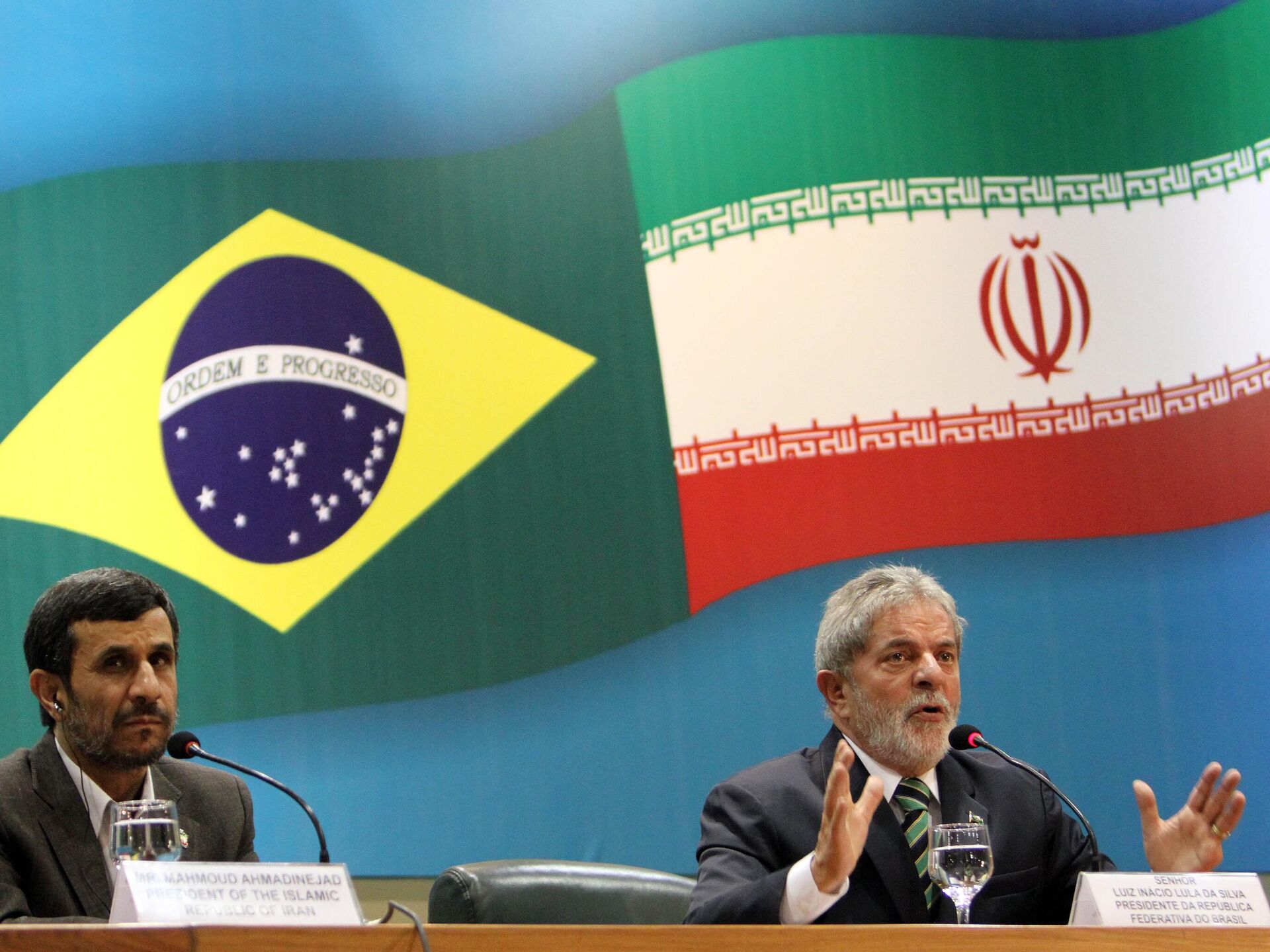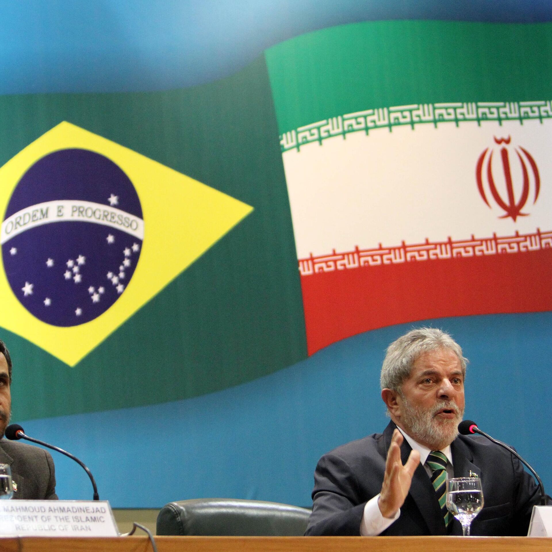 O presidente brasileiro Luiz Inácio Lula da Silva, à direita, fala enquanto o presidente iraniano Mahmoud Ahmadinejad ouve durante uma reunião em Brasília, 23 de novembro de 2009 (foto de arquivo) - Sputnik Brasil, 1920, 27.06.2025