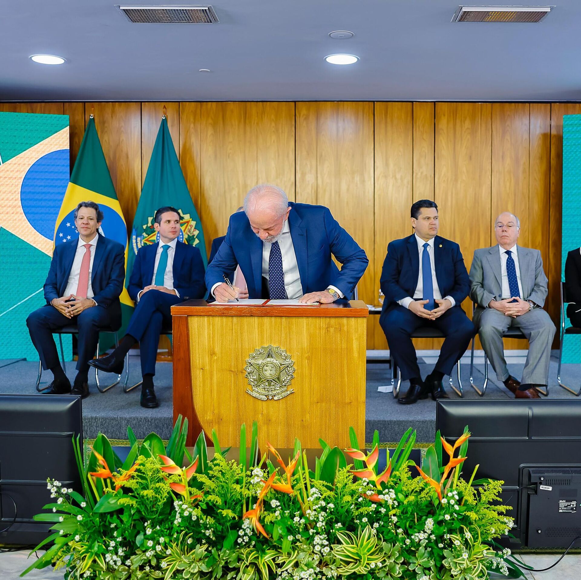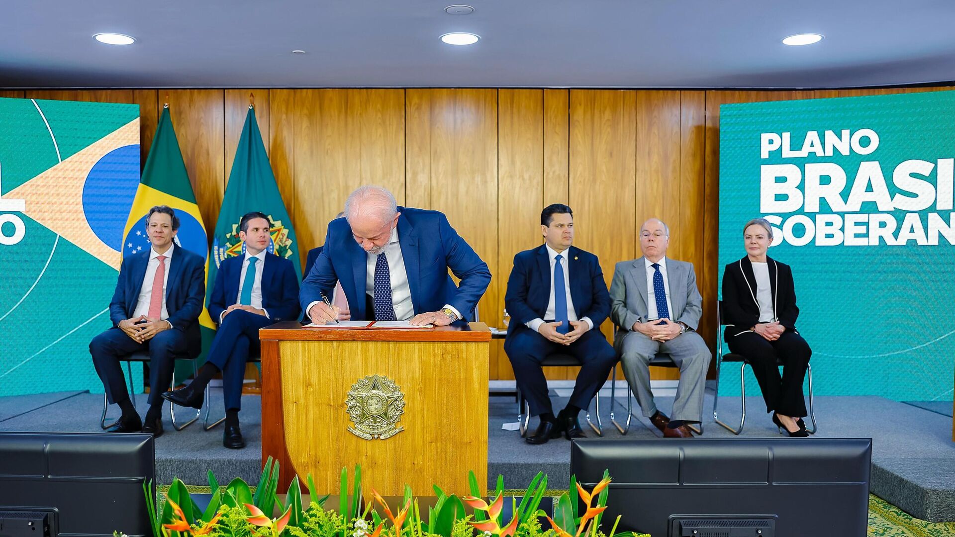 Em seu discurso, o presidente Luiz Inácio Lula da Silva afirmou que agora a "bola" da mitigação dos efeitos das tarifas norte-americanas está com o Congresso, representados na cerimônia pelos presidentes do Senado e da Câmara, Davi Alcolumbre e Hugo Motta.