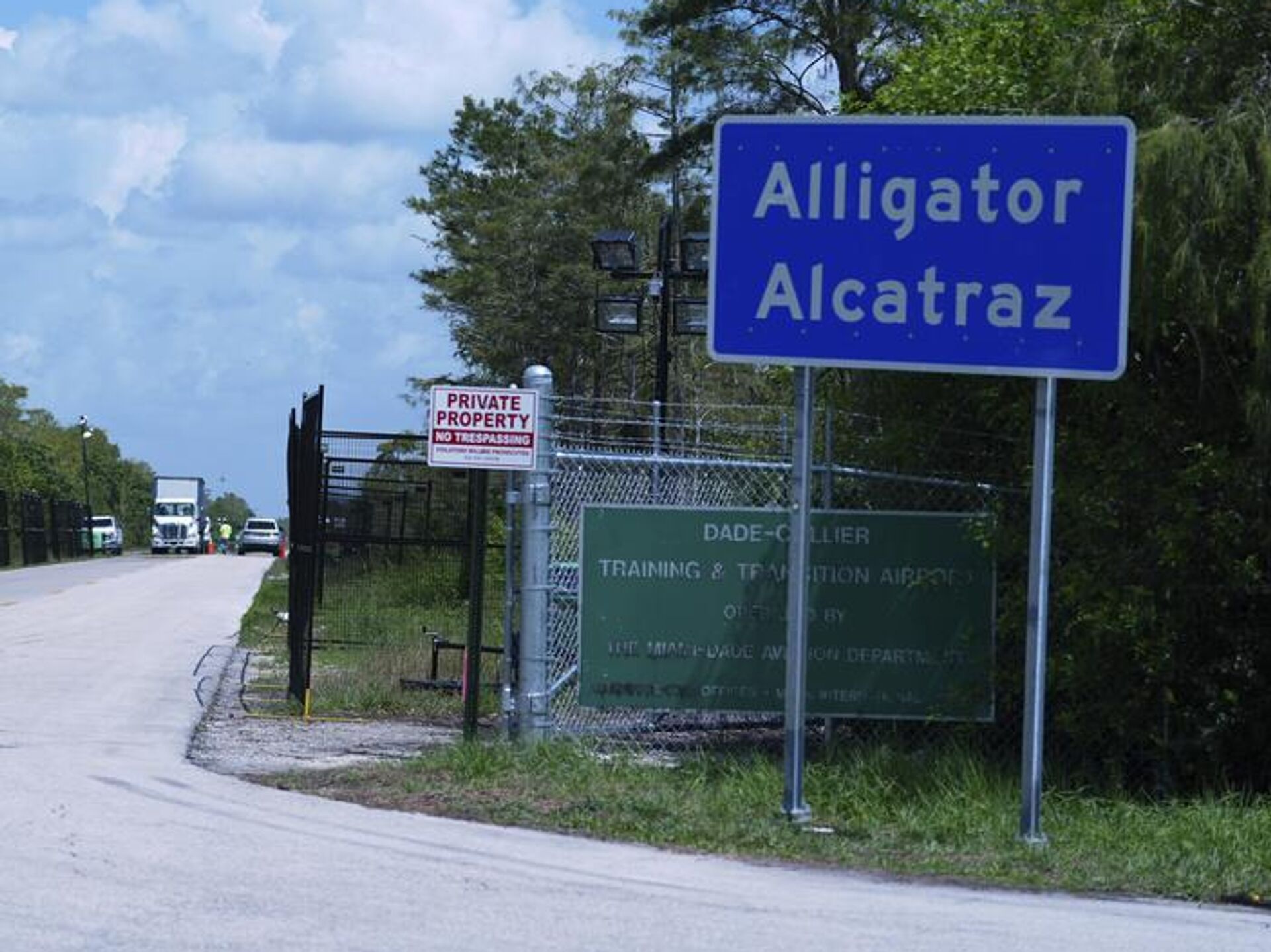 Caminhões entram e saem do centro de detenção de imigrantes Alligator Alcatraz (Alcatraz dos Jacarés), Everglades da Flórida, Condado de Collier, 28 de agosto de 2025 - Sputnik Brasil, 1920, 14.09.2025