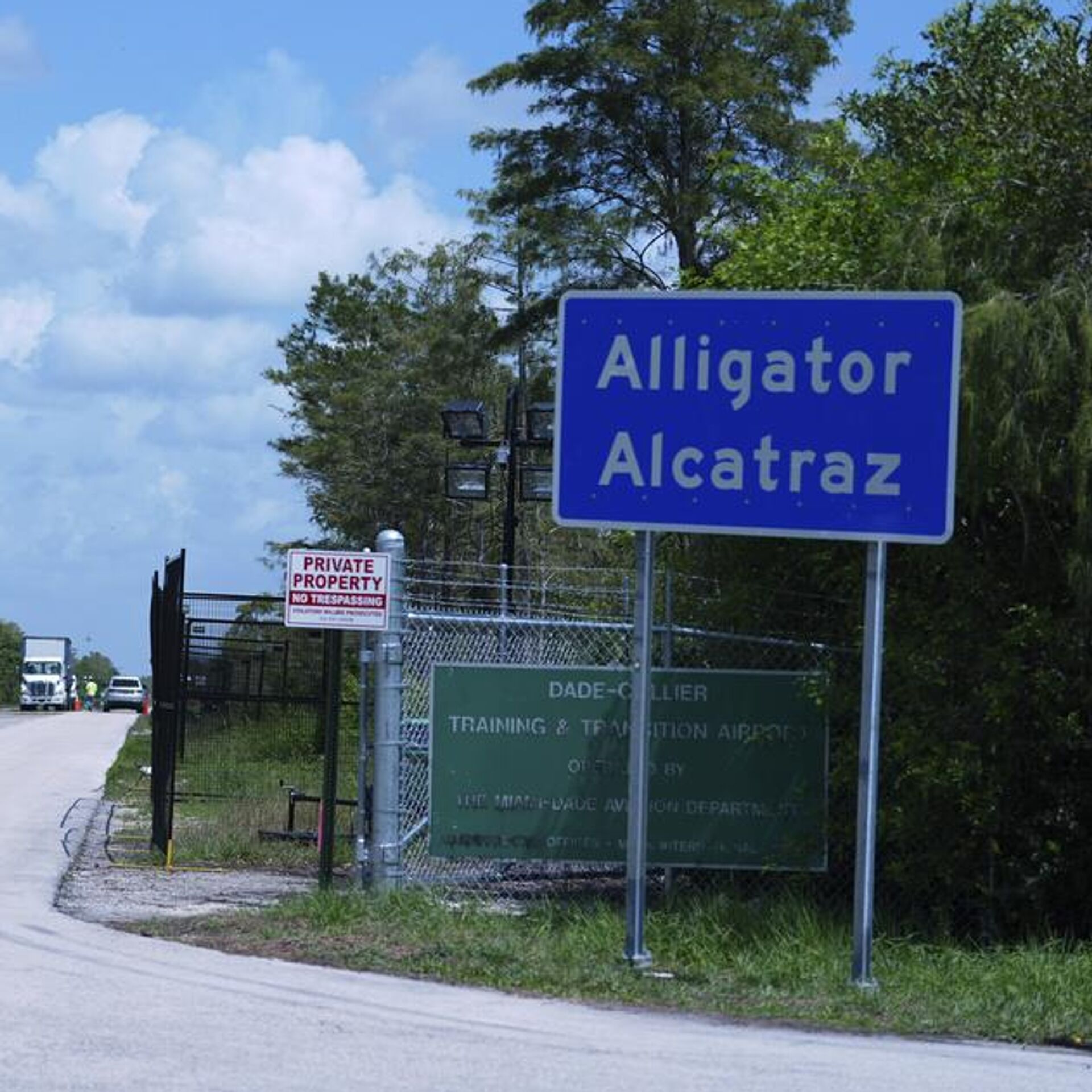© AP Photo / Rebecca BlackwellCaminhões entram e saem do centro de detenção de imigrantes Alligator Alcatraz (Alcatraz dos Jacarés), Everglades da Flórida, Condado de Collier, 28 de agosto de 2025