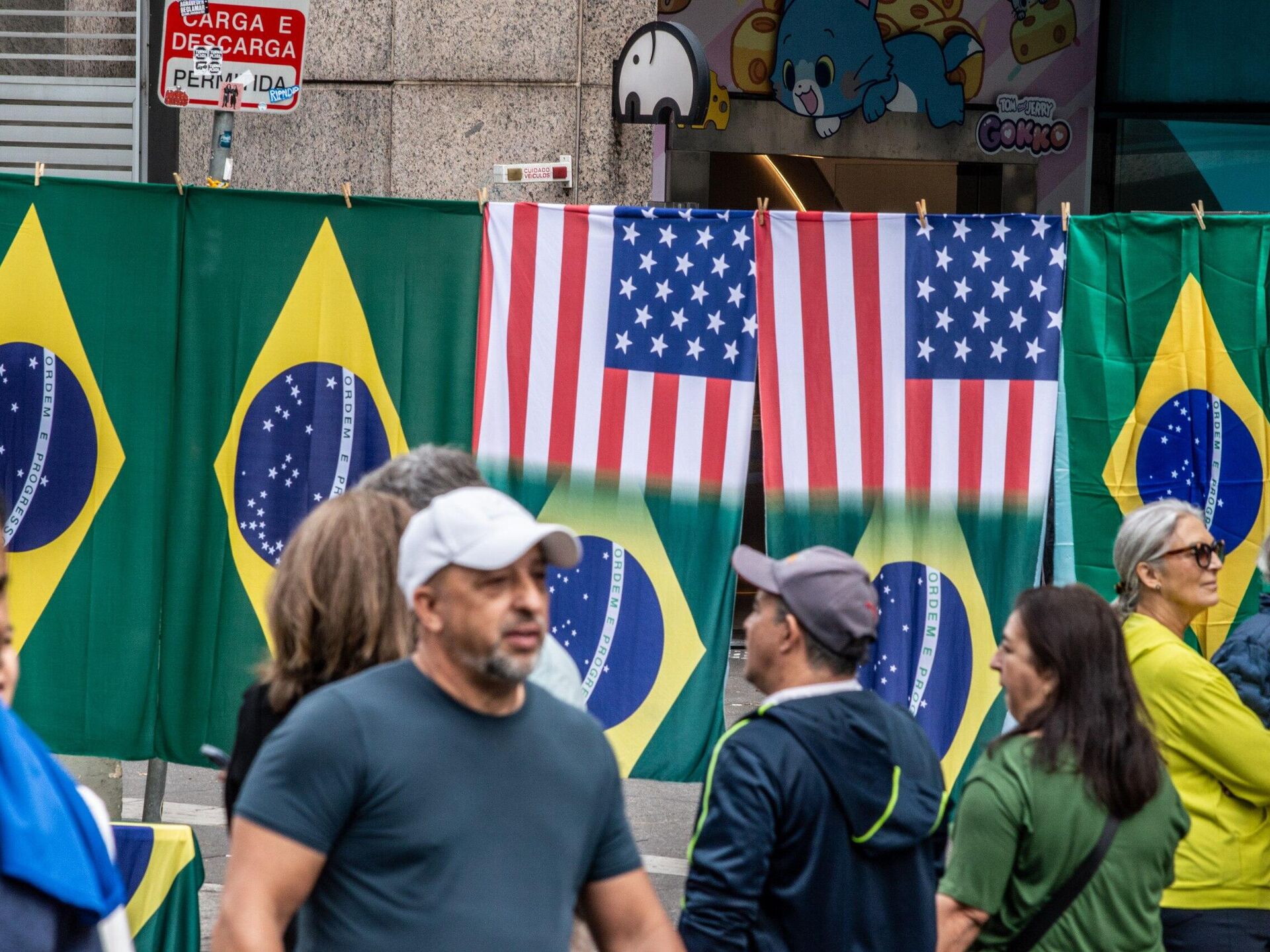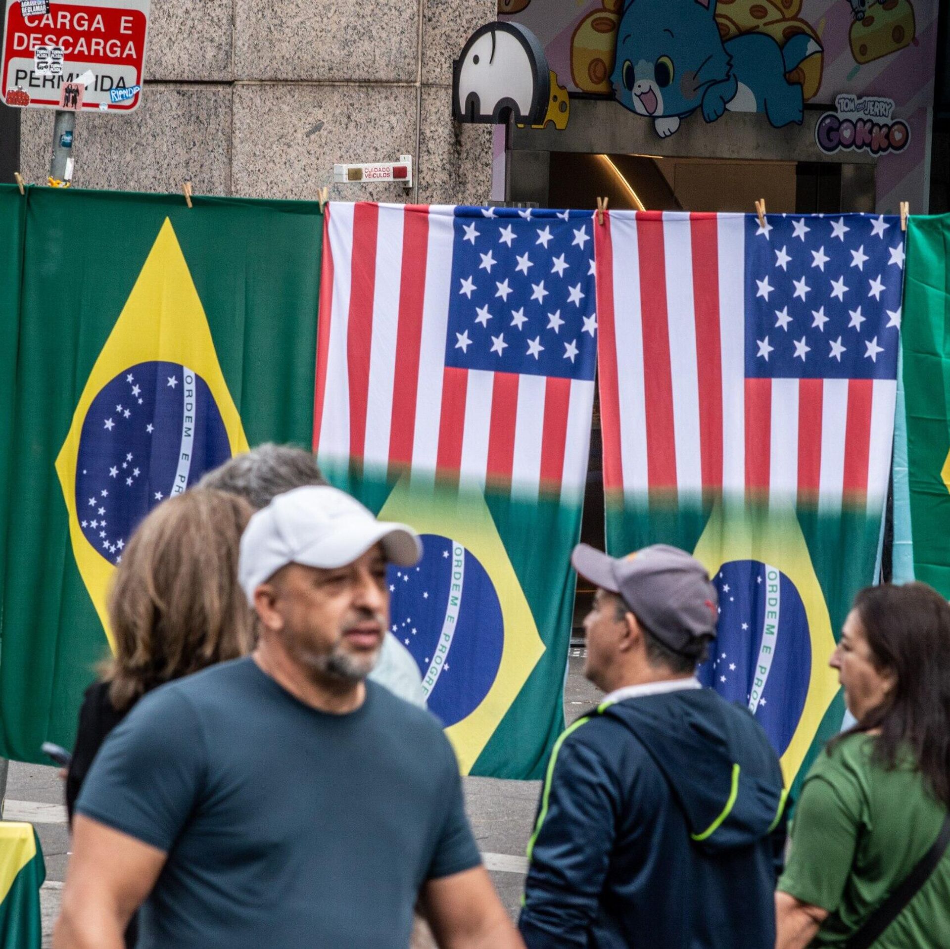 Manifestantes com cartazes na avenida Paulista que criticam a política do presidente norte-americano, Donald Trump, contra o Brasil. São Paulo, Brasil, 10 de julho de 2025 - Sputnik Brasil, 1920, 17.07.2025