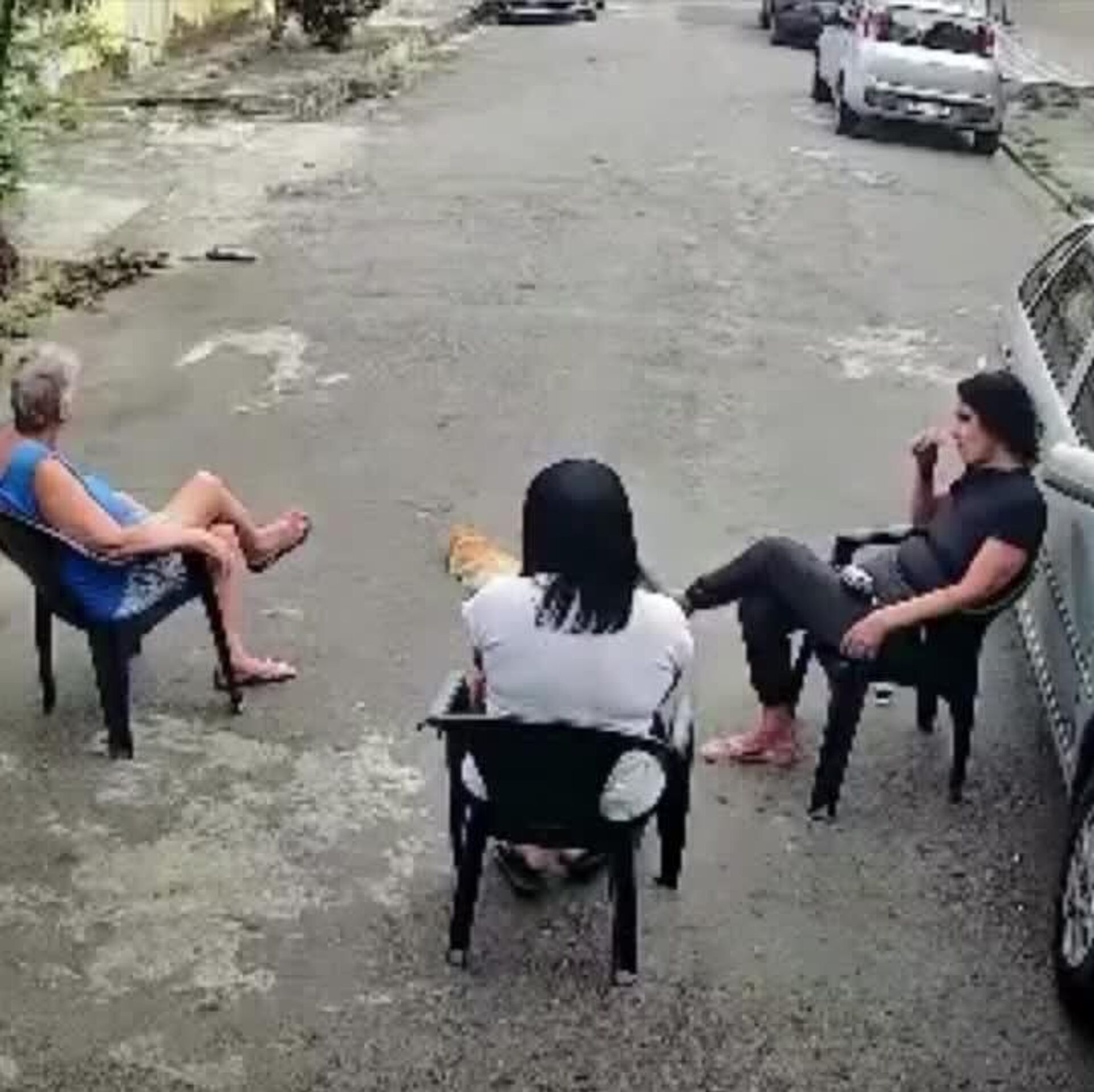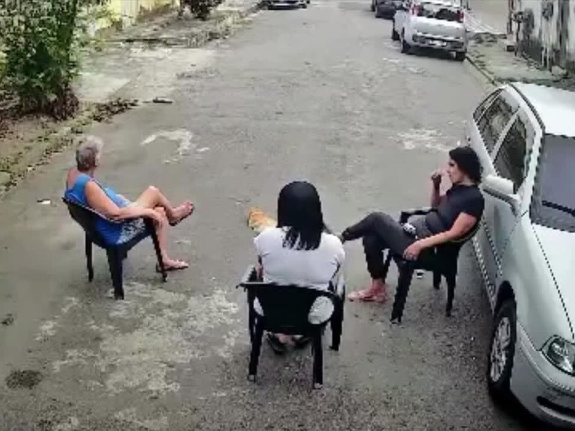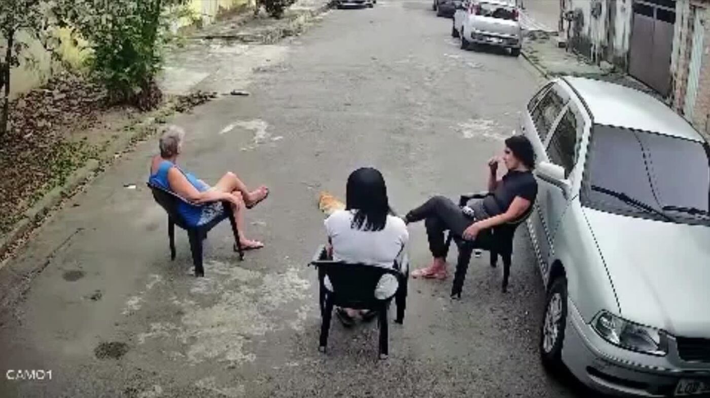 A tutora conversava com amigas no portão de casa quando o cachorro do vizinho escapou e correu em direção ao grupo. Foi então que o felino saltou contra o pitbull e interrompeu o ataque.