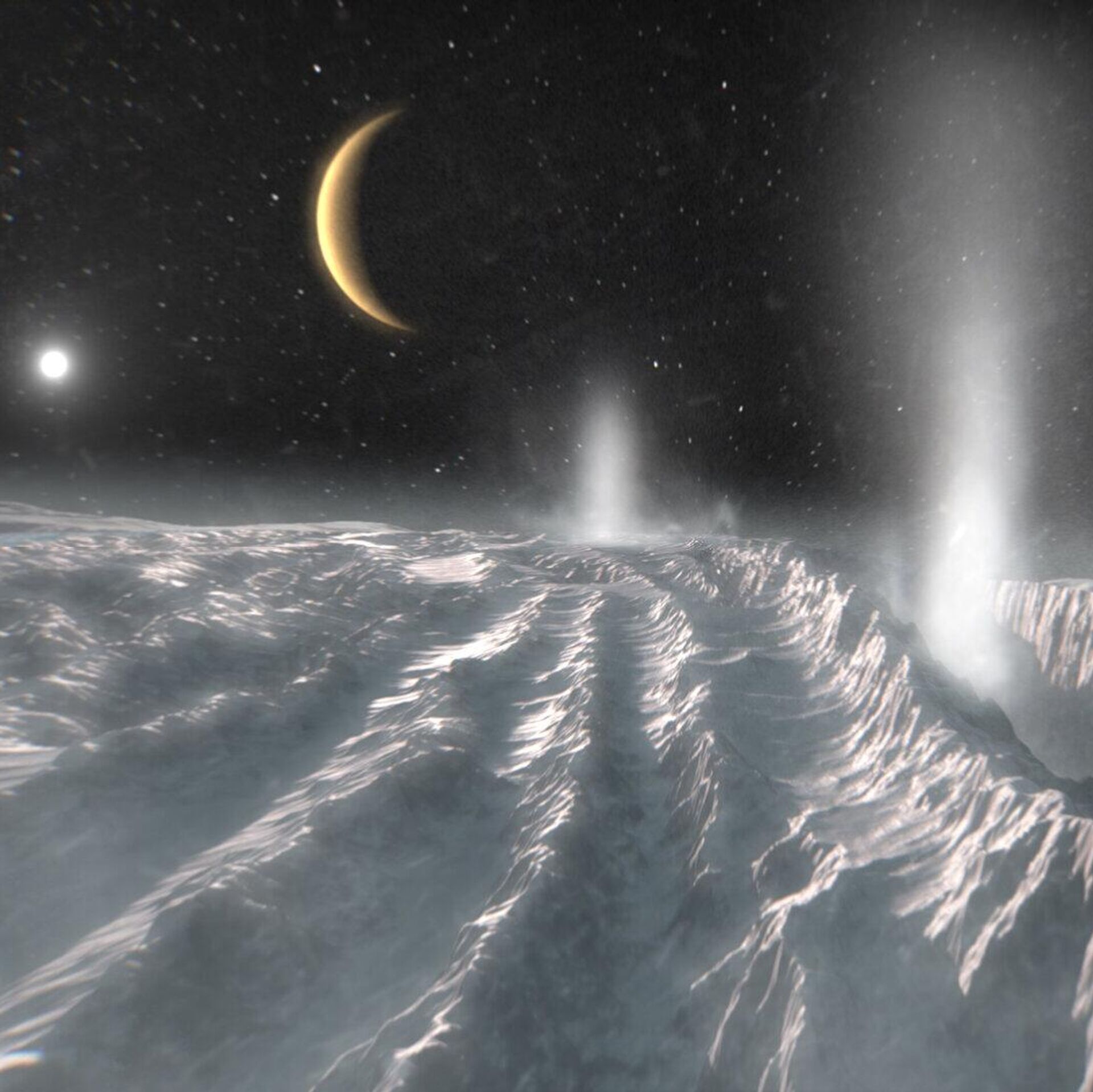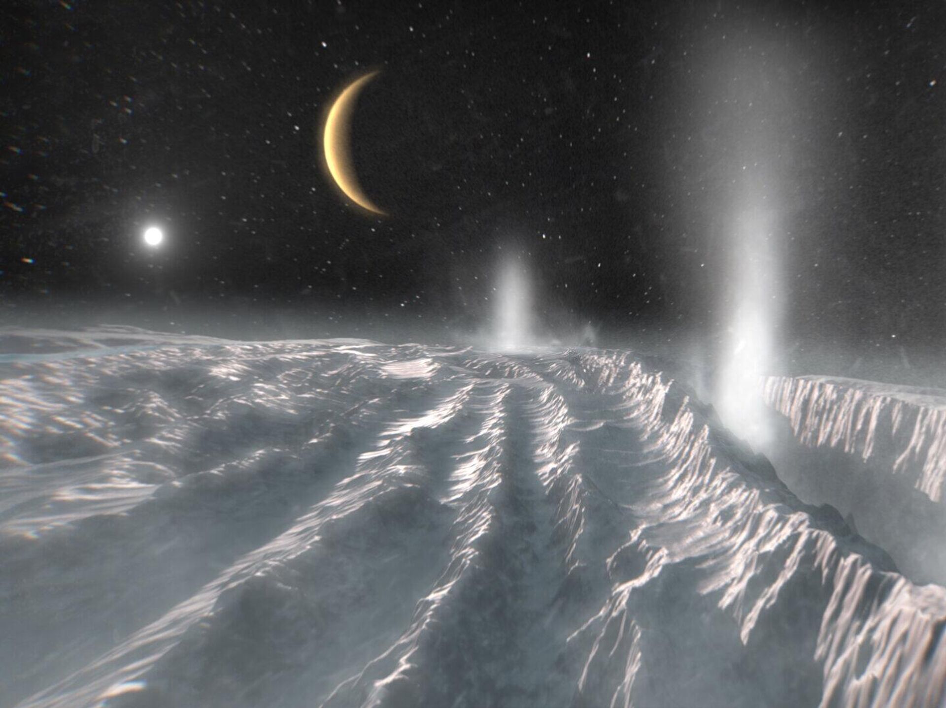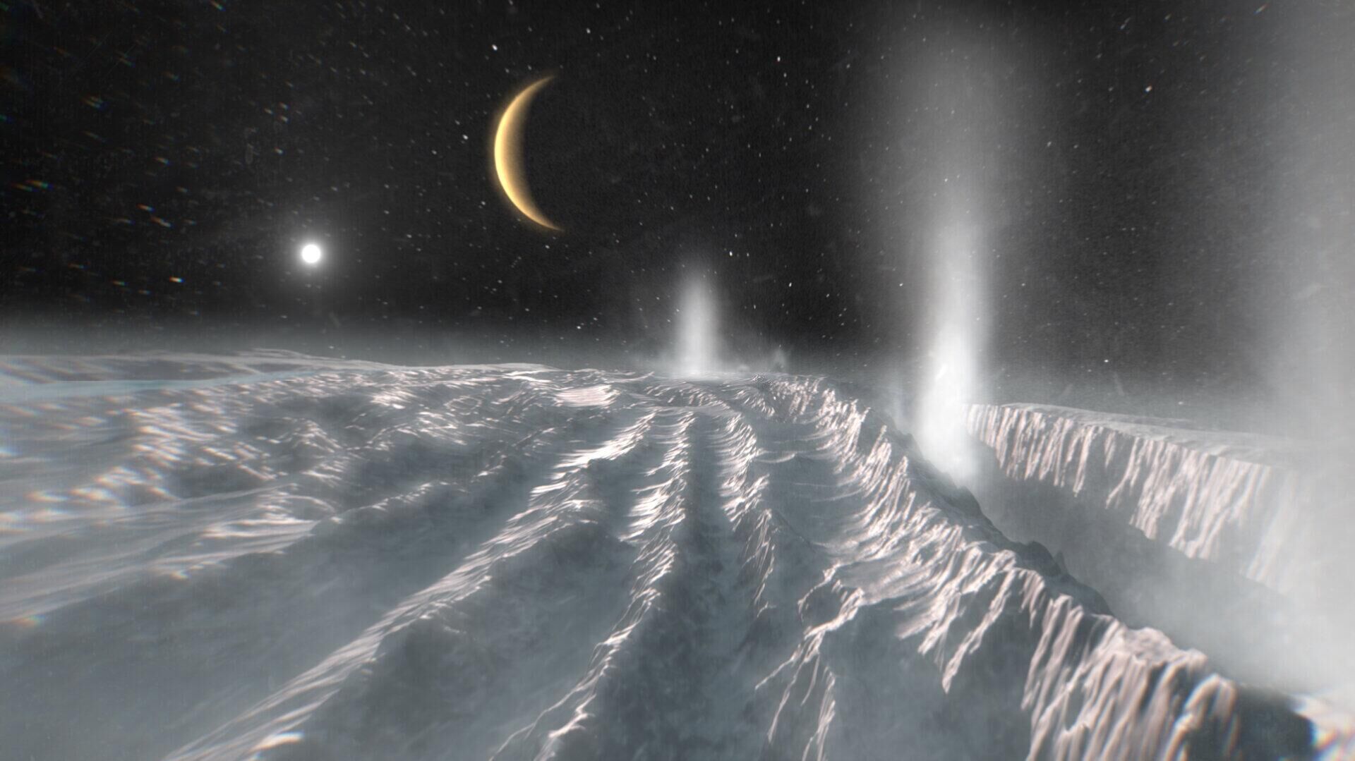 Impressão artística retrata plumas térmicas saindo da região polar sul da lua de Saturno, Encélado. Acredita-se que a camada de gelo da lua cubra um oceano global - Sputnik Brasil, 1920, 02.10.2025