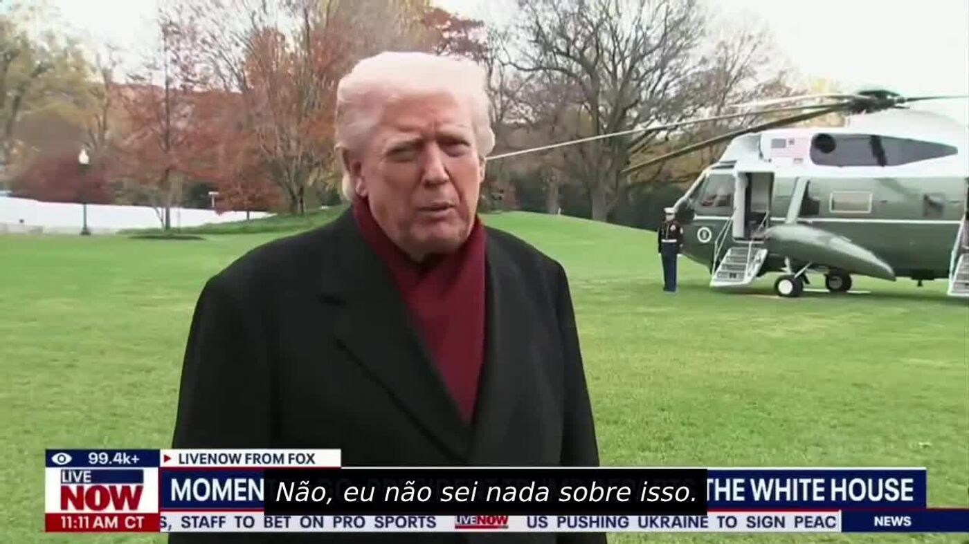 "Não sei nada sobre isso… Foi isso que aconteceu? É uma pena. Eu só acho que é uma pena."Antes disso, Trump pareceu compreender mal a pergunta e disse que havia conversado na noite anterior com Bolsonaro e que em breve iria encontrá-lo.