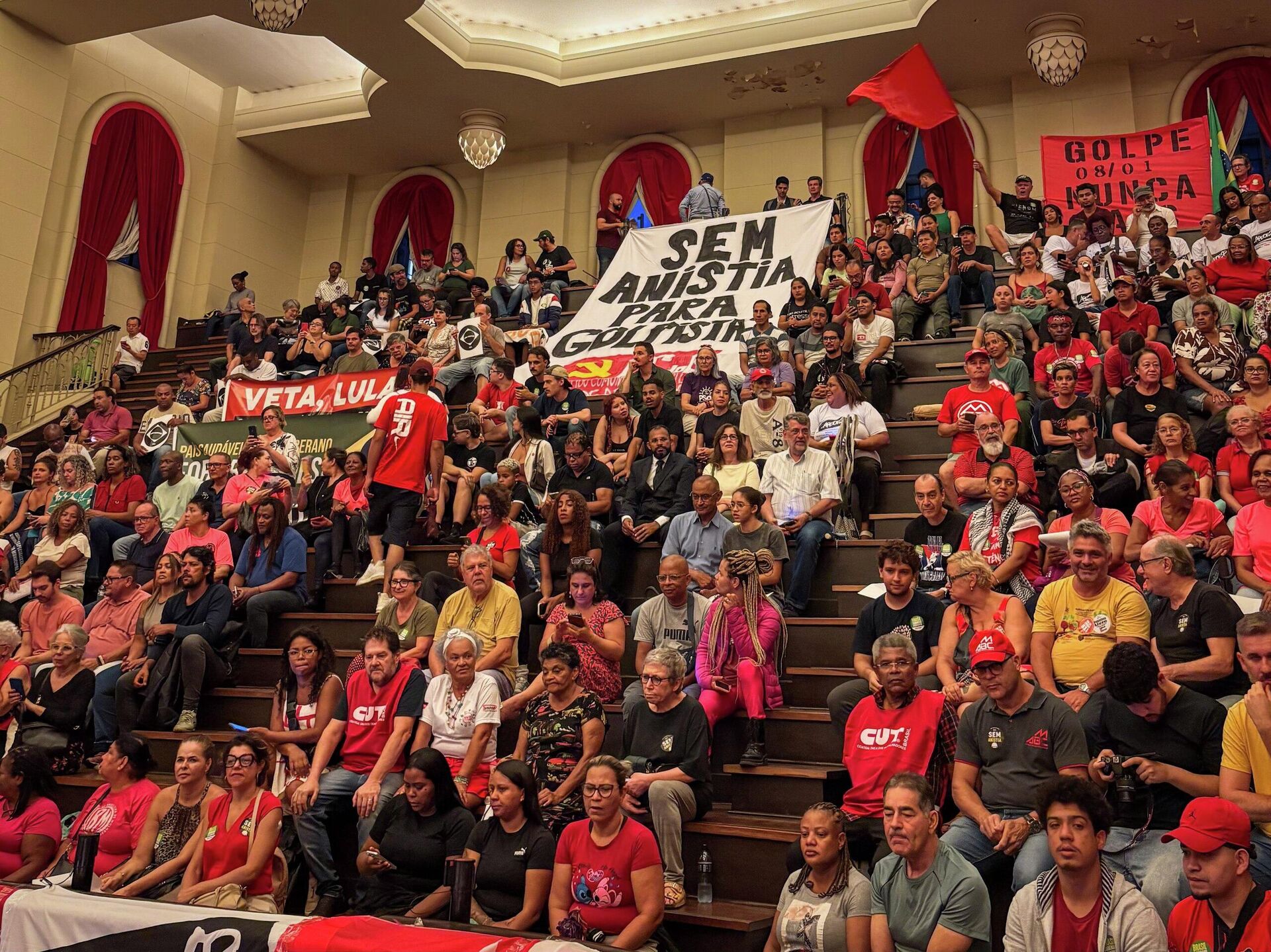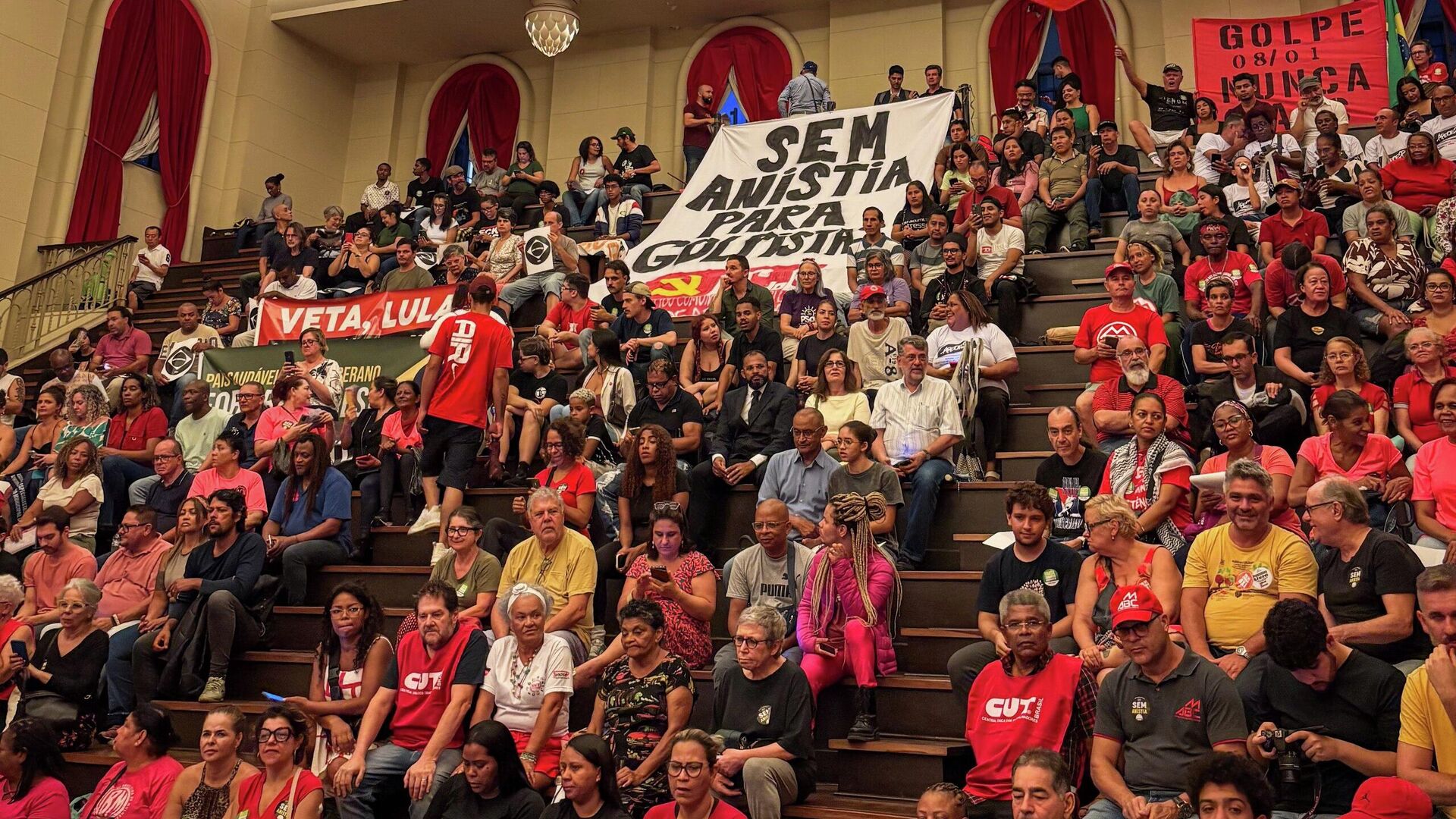 A mobilização foi organizada por entidades como o Partido dos Trabalhadores (PT) de São Paulo, o grupo Prerrogativas e outras cerca de 40 organizações, e coincidiu com os três anos dos ataques de 8 de janeiro de 2023. O ato também ocorreu horas depois do presidente Luiz Inácio Lula da Silva (PT) vetar integralmente o PL da Dosimetria durante cerimônia em Brasília (DF). De acordo com participantes, o clima esquentou quando o ex-deputado estadual Douglas Garcia (União Brasil), acompanhado do vereador Rubinho Nunes (União Brasil) e de assessores, passou a abordar manifestantes no segundo andar do prédio. O grupo foi apontado como responsável por provocações que desencadearam o tumulto. A confusão rapidamente se espalhou para a área externa, onde militantes de direita e esquerda chegaram a trocar socos e empurrões. Policiais que acompanhavam o ato não intervieram. No Largo de São Francisco, organizadores reforçaram que o 8 de janeiro deve ser lembrado como marco de resistência democrática. Manifesto assinado por mais de 200 personalidades, entre elas Marco Aurélio de Carvalho, a senadora Teresa Leitão (PT-PE) e o advogado Pierpaolo Bottini, defende criar uma memória coletiva sobre os ataques de 2023. O documento afirma que a data representa "uma festa cívica histórica em defesa da democracia" e alerta para a necessidade de vigilância permanente contra ameaças ao Estado de Direito. Durante o ato, palavras de ordem como "sem anistia" foram repetidas por todo o público, que também entoou críticas ao presidente dos Estados Unidos, Donald Trump. "Se cuida imperialista, a América Latina vai ser toda socialista", cantavam. O ator Paulo Betti, que conduziu a cerimônia, pediu mobilização para impedir que o Congresso derrube o veto presidencial ao PL da Dosimetria, afirmando que a eleição de parlamentares comprometidos com a democracia será decisiva. Participaram ainda o ex-presidente do PT, José Genoíno, ovacionado pelos presentes, e o deputado federal Ricardo Galvão (Rede), ex-diretor do Instituto Nacional de Pesquisas Espaciais (INPE). Em discurso, Genoíno defendeu o enfrentamento ao que chamou de "classe dominante corrupta, entreguista e autoritária" e afirmou que a disputa em torno da dosimetria deve ser travada "nas ruas e não apenas nos palácios". O PL vetado poderia beneficiar condenados pelos atos golpistas, incluindo o ex-presidente Jair Bolsonaro (PL), preso na sede da Polícia Federal em Brasília. Ataque a Brasília O 8 de janeiro de 2023 ficou marcado pela invasão e depredação das sedes dos Três Poderes em Brasília por apoiadores do então presidente Bolsonaro, em atos amplamente qualificados como tentativa de golpe de Estado. Naquele dia, manifestantes invadiram o Congresso Nacional, o Palácio do Planalto e o Supremo Tribunal Federal (STF) em protesto contra o resultado das eleições presidenciais de 2022. Lula afirmou que a data é "uma exaltação ao momento que estamos vivendo, de manutenção do Estado Democrático de Direito" e destacou que "a democracia precisa ser defendida todos os dias", ressaltando o papel das instituições e da participação cidadã. Em publicação nas redes sociais, o presidente reforçou que o episódio de 8 de janeiro "é um dia para não esquecer", em referência aos ataques que chocaram o país e marcaram sua história recente.