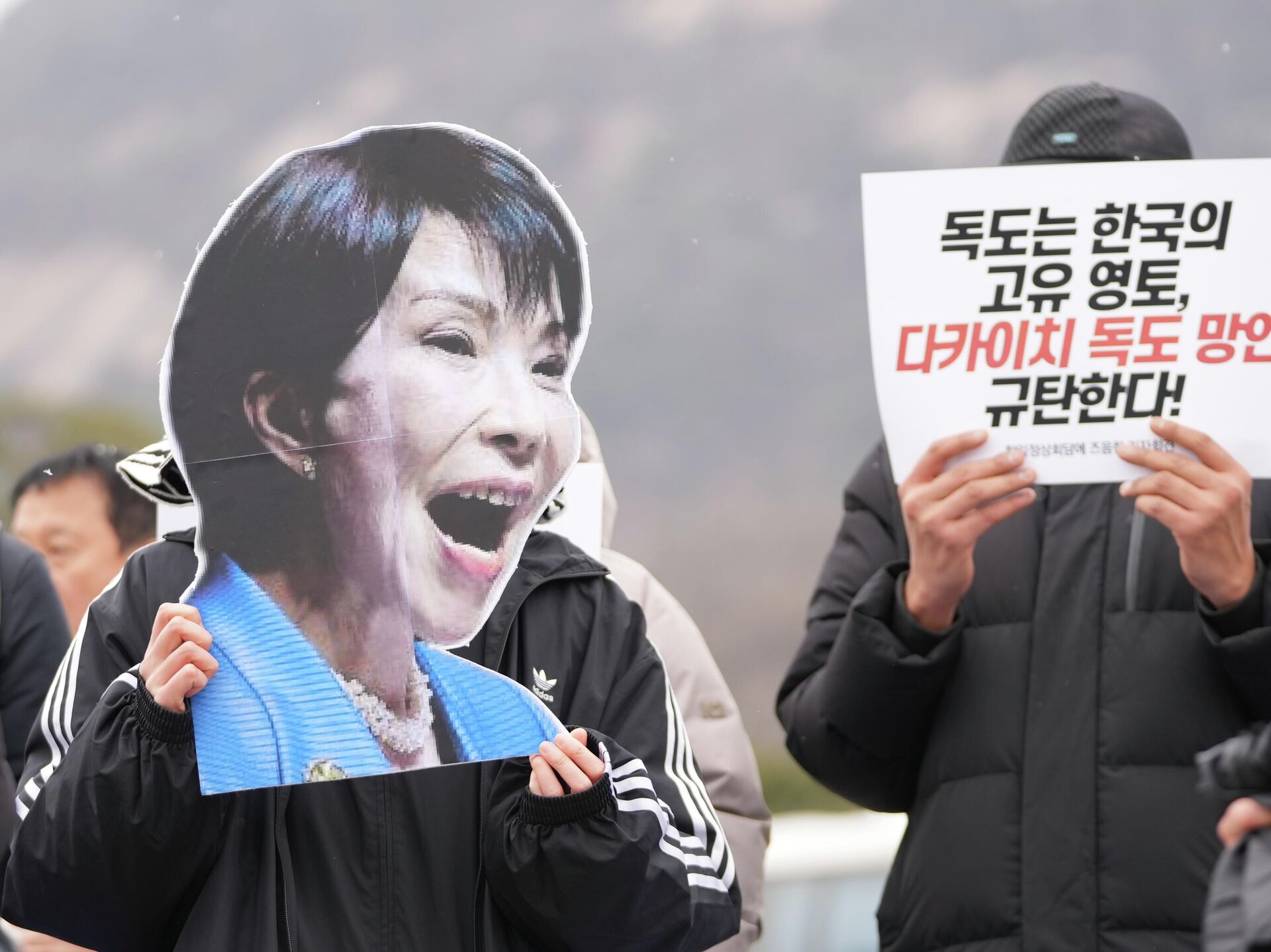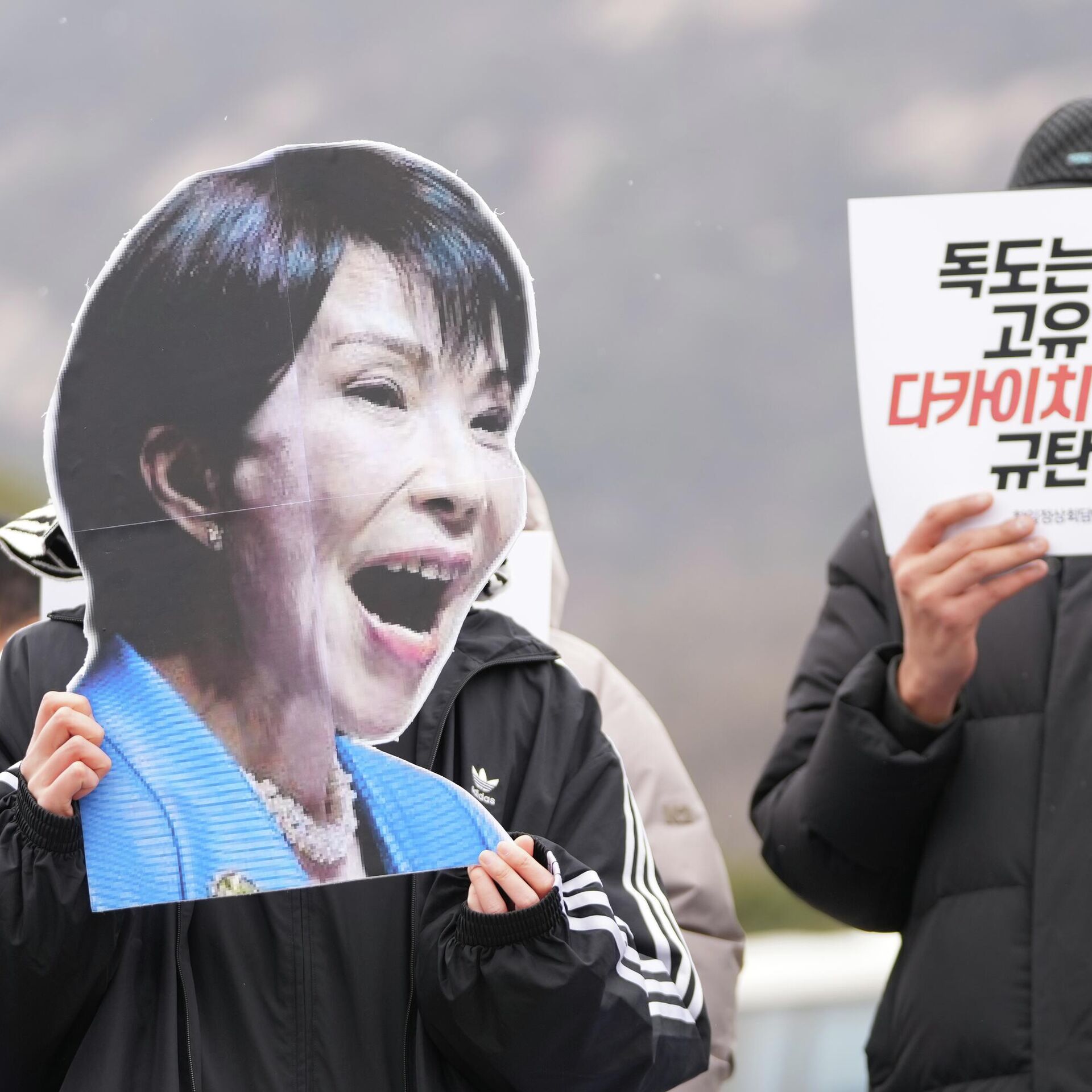© AP Photo / Lee Jin-manManifestante segura foto da primeira-ministra japonesa Sanae Takaichi ao lado de um cartaz que diz "Dokdo é território da Coreia do Sul" e "Denunciem o comentário de Takaichi sobre Dokdo" durante um protesto antes da cúpula entre a Coreia do Sul e o Japão, em Seul, Coreia do Sul, 12 de janeiro de 2026.