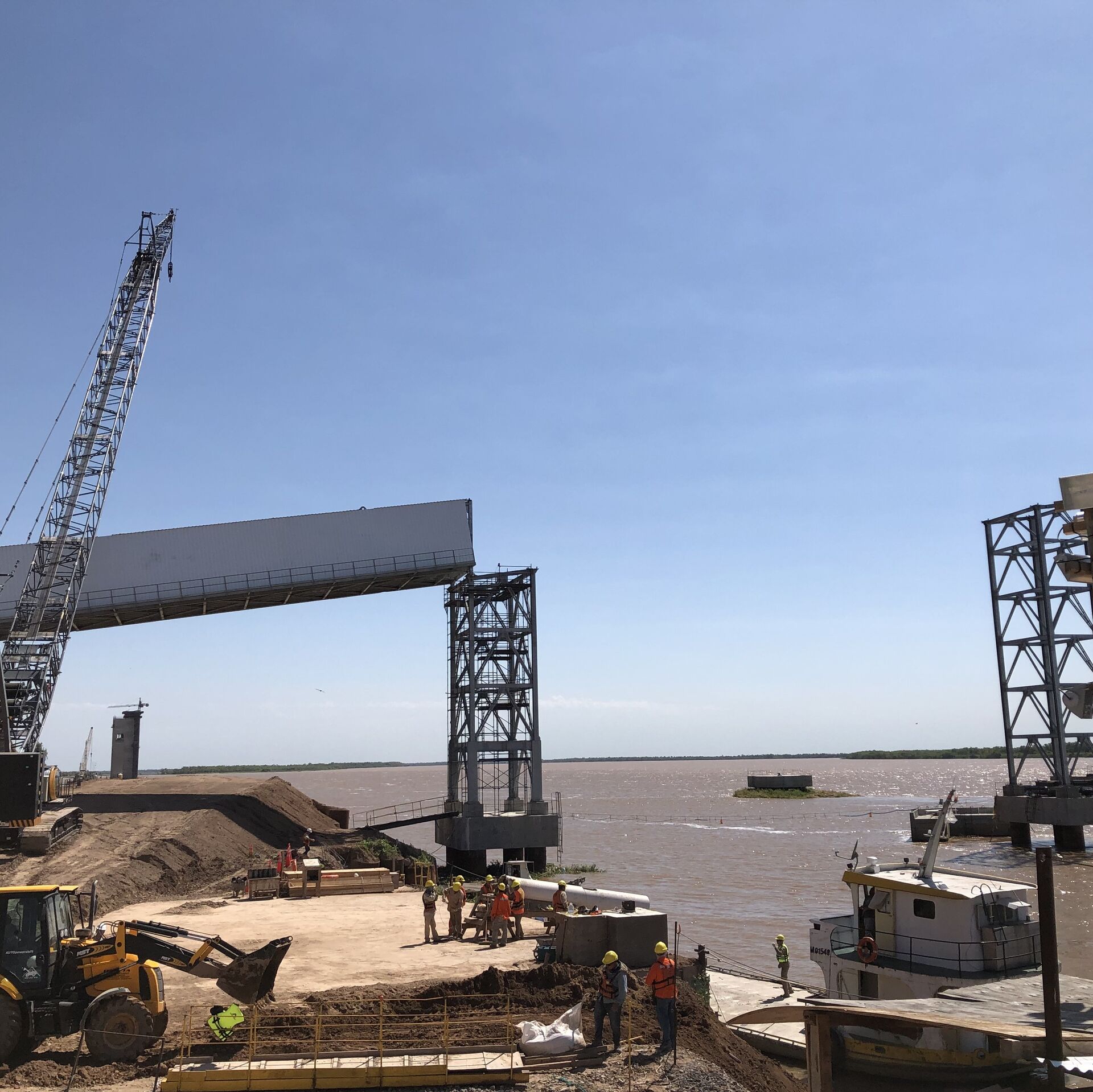 carregador móvel de navios, seis pás carregadeiras, balanças rodoviárias e canhões de névoa.