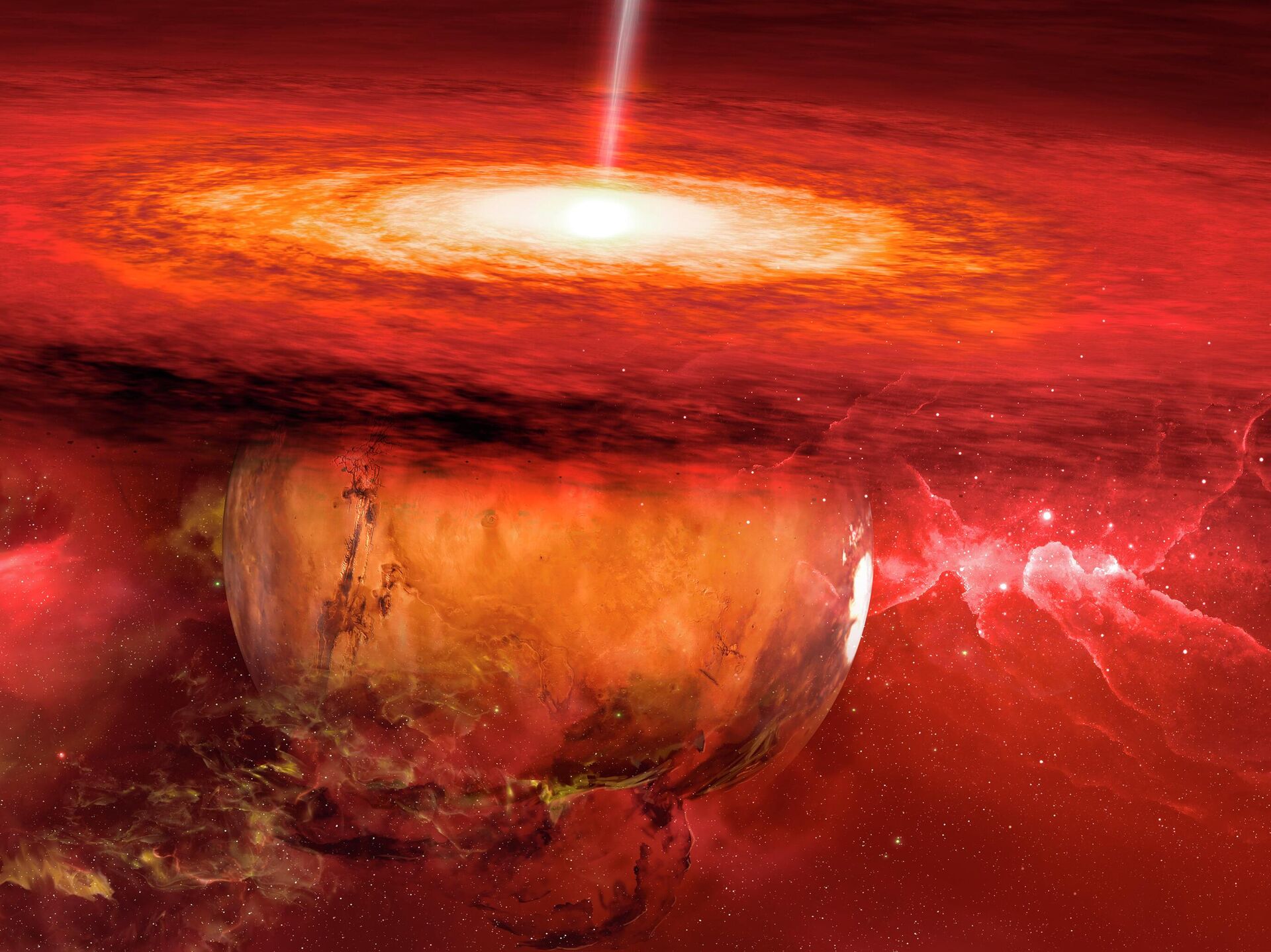 Marte é propenso a tempestades de poeira extremas e outros eventos climáticos. À esquerda, uma representação atmosférica do planeta em 26 de junho de 2001; à direita, Marte imerso em uma tempestade de areia global em 4 de setembro do mesmo ano, segundo observações do Hubble