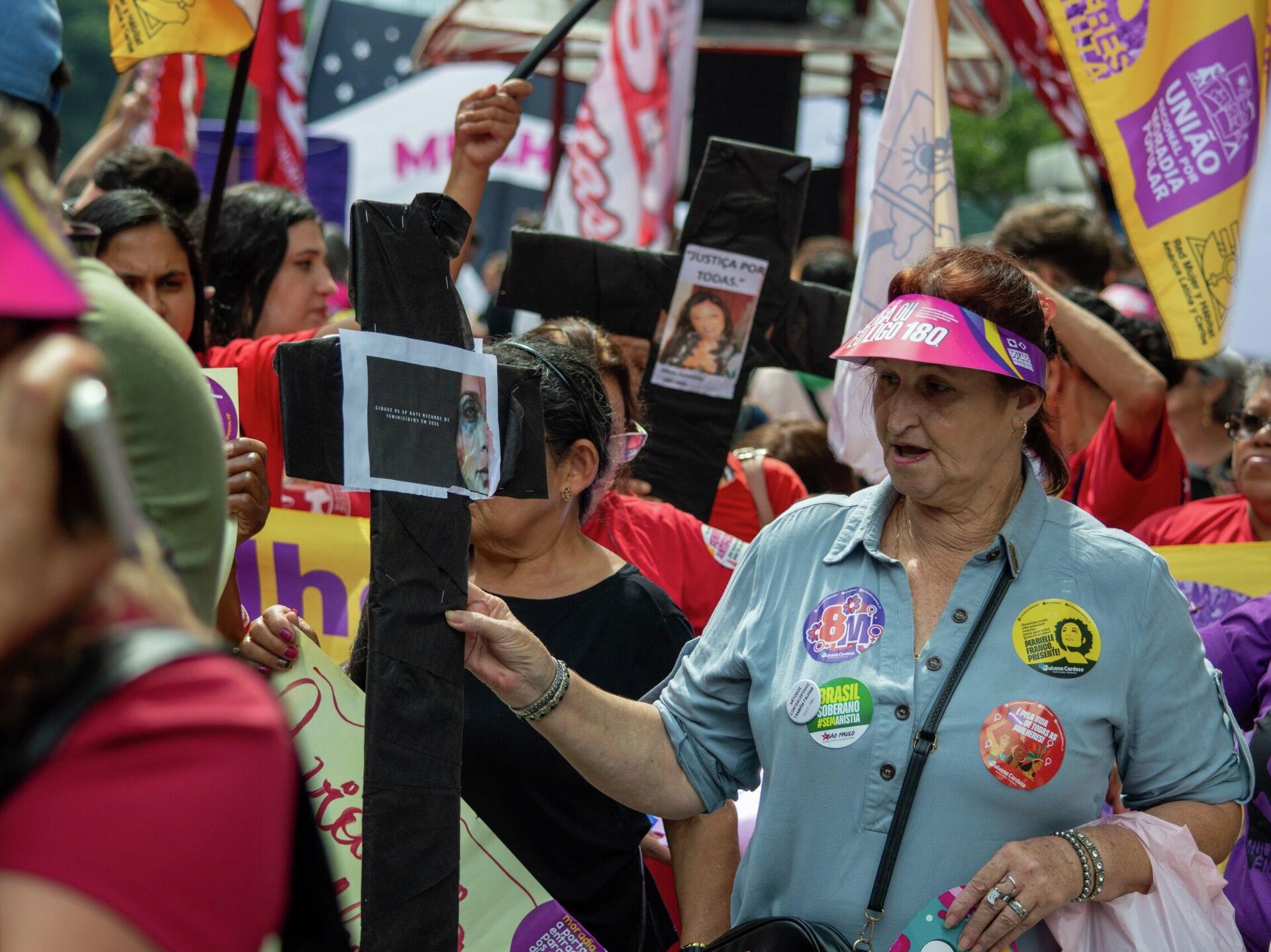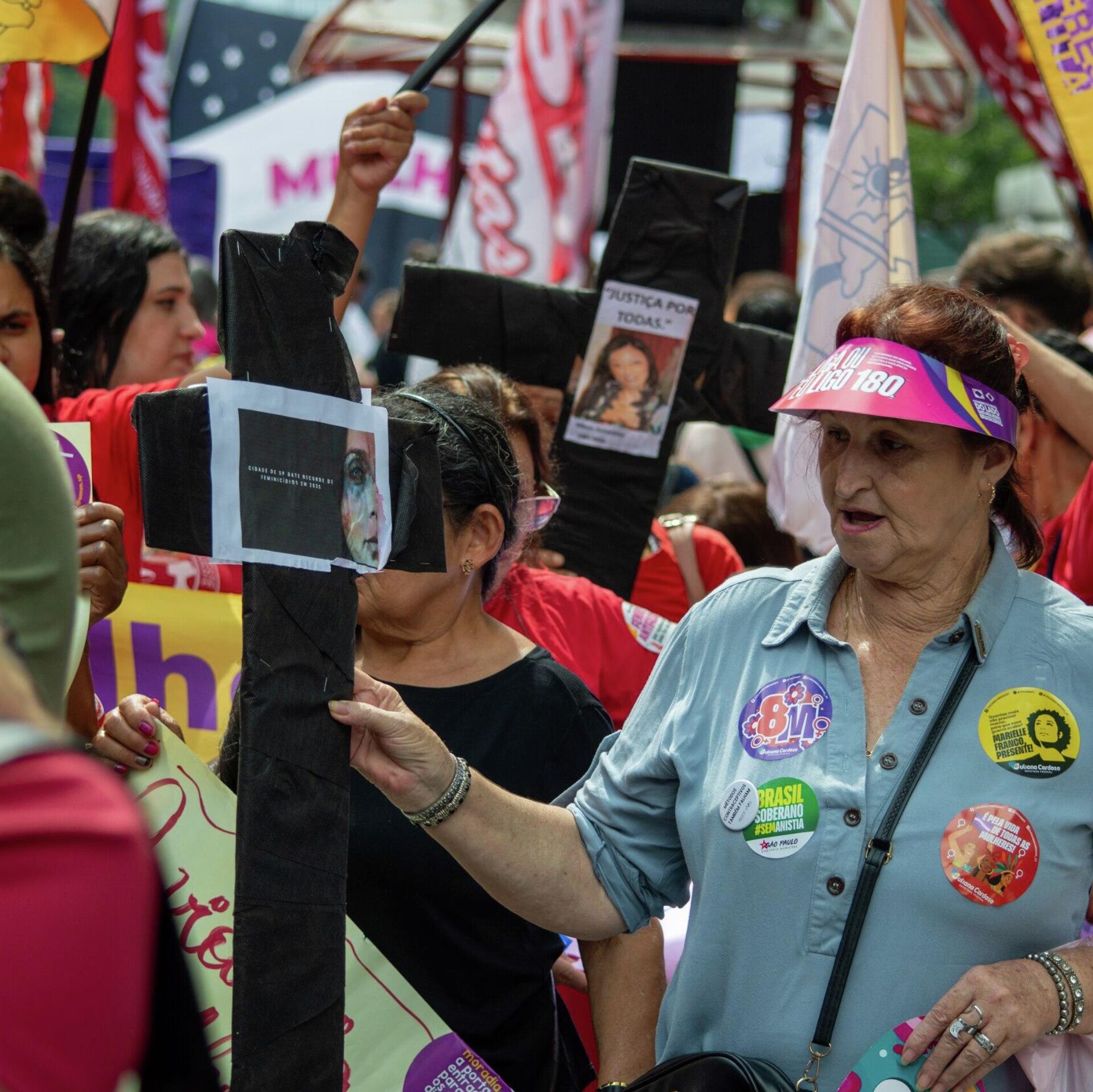 Pela manhã, caminhada organizada por parlamentares do Podemos reuniu políticos e familiares de vítimas. À tarde, movimentos sindicais, sociais e organizações da sociedade civil se concentraram a partir das 14h00 no vão do Museu de Arte de São Paulo (MASP). Houve princípio de confusão devido a dois homens que estavam no meio da manifestação carregando imagens do ex-presidente Jair Bolsonaro e do presidente dos Estados Unidos, Donald Trump. A presença dos dois provocou reação de parte de manifestantes, com empurrões e troca de ofensas. A Guarda Civil Metropolitana (GCM) interveio e passou a escoltar os dois homens para fora da concentração, isolando-os do restante do público. Durante a ação de dispersão, agentes chegaram a utilizar gás de pimenta. Feminicídio O contexto das manifestações é de recorde histórico de feminicídios no estado de São Paulo, que registrou 270 mulheres mortas em 2025, alta de 96,4% em relação a 2021. Entre as pautas do ato estavam ainda o fim da escala 6x1 e a ampliação de políticas públicas de proteção à mulher.