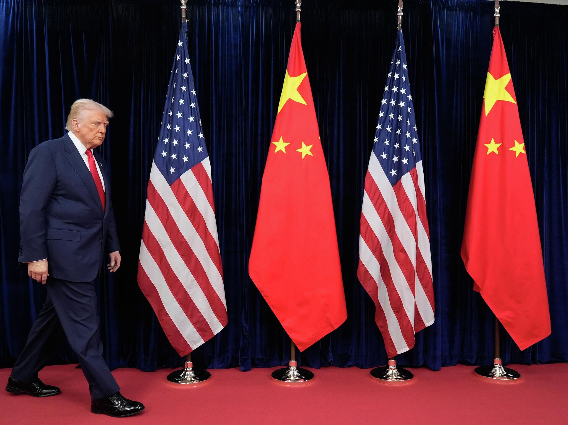 © AP Photo / Mark SchiefelbeinO presidente norte-americano Donald Trump caminha em frente às bandeiras dos EUA e da China para se encontrar com o presidente chinês Xi Jinping no Aeroporto Internacional de Gimhae, em Busan, Coreia do Sul, 30 de outubro de 2025