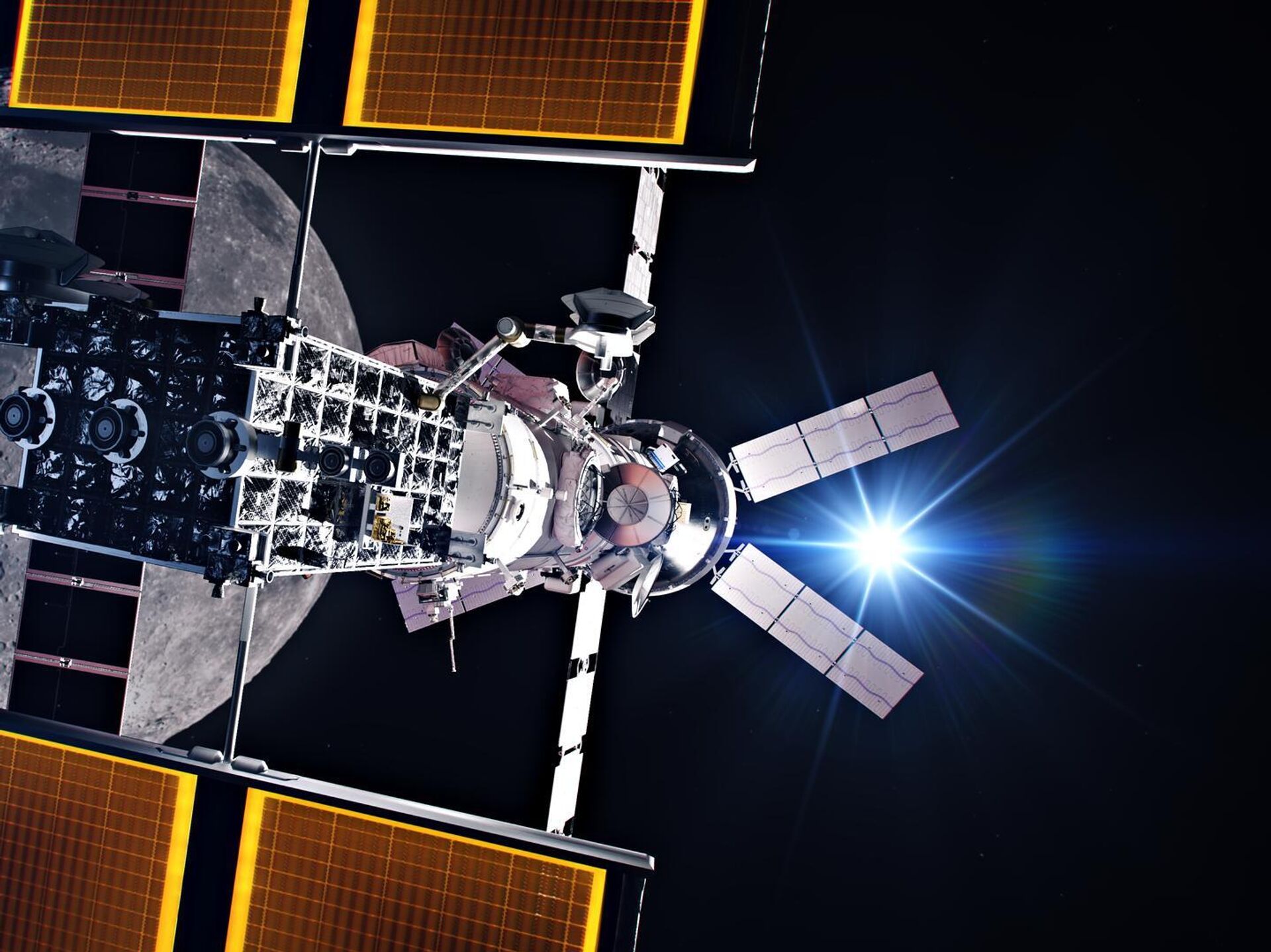 Ilustração artística do portal espacial anunciado em 2017. Localizado mais distante da Terra do que a atual Estação Espacial Internacional – mas não em órbita lunar – o portal servirá como ponto de apoio para missões à Lua e a Marte. Como um refúgio nas montanhas, ele oferecerá abrigo e um local para reabastecimento de suprimentos para os astronautas a caminho de destinos mais distantes. Também servirá como ponto de retransmissão de comunicações e poderá funcionar como base para pesquisas científicas