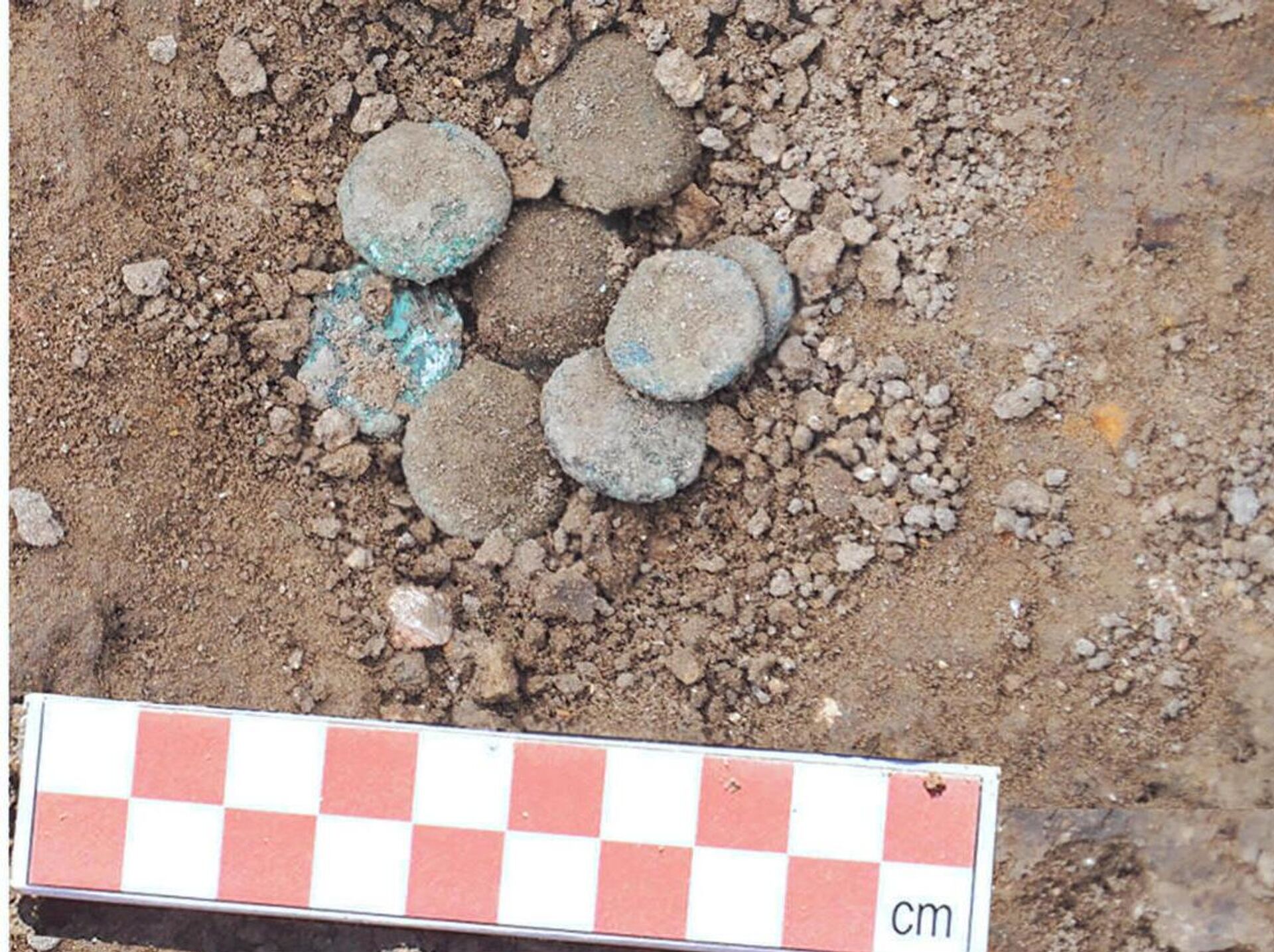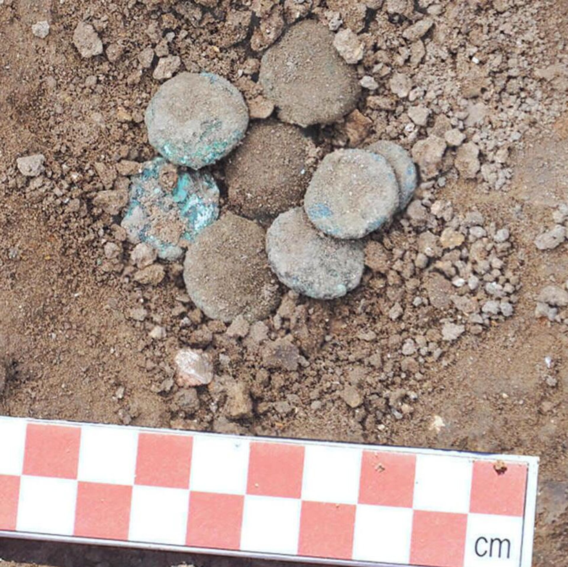 A carteira contendo moedas do século VI no momento da descoberta - Sputnik Brasil, 1920, 20.04.2026