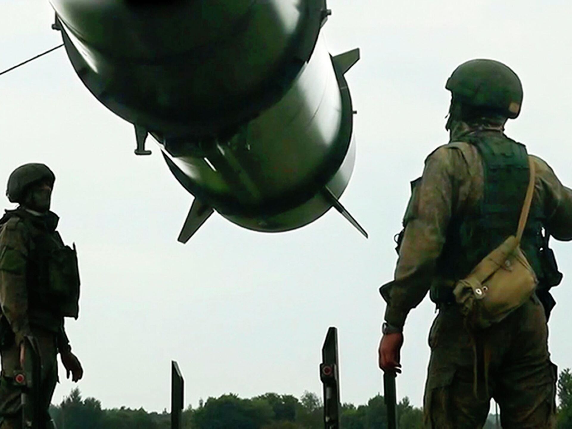 © AP Photo / Ministério da Defesa da RússiaSoldados russos carregam lançadores de mísseis balísticos de curto alcance Iskander-M em uma posição de tiro como parte de um exercício militar destinado a treinar as tropas no uso de armas nucleares táticas.